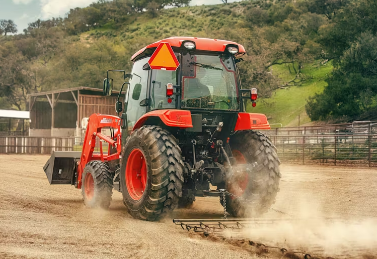 The KIOTI NS4710C HST is a 45-horsepower compact utility tractor with a factory installed cab, and synchro shuttle transmission. It features a comfortable suspension seat, easy-to-use twin HST pedals, and a standard rear PTO.