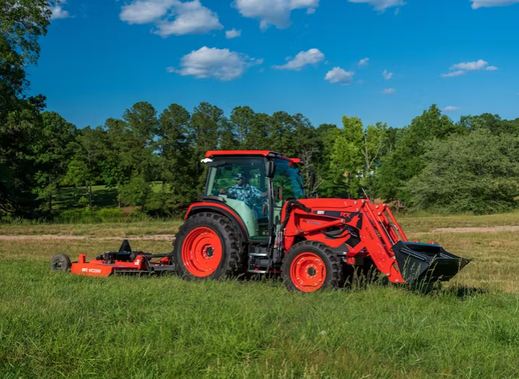 KIOTI RX7340PC utility tractor with power shuttle transmission, 73-horspower engine, and factory installed cab offering the ultimate blend of power, comfort, versatility, and affordability. It is KIOTI Connect ready for seamless equipment management, providing real-time insights, maintenance tracking, and remote diagnostics.